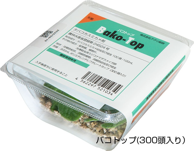 バコトップは、タバコカスミカメの幼虫と成虫をカップに封入した製剤です。害虫の初期発生時に施設内に放飼すると、コナジラミ類、アザミウマ類の成虫や幼虫を探索し、大量に捕食します。